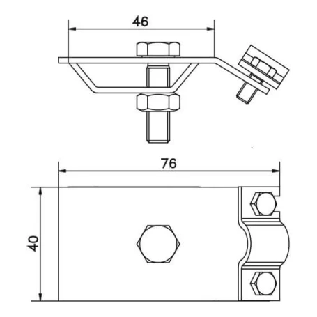 Rozměry a montáž. Kompaktní konstrukce (76 × 46 × 40 mm) usnadňuje montáž i na těžko přístupných místech. Držák se nasadí na hranu okapu a poté se dotáhnou šrouby — hromosvod je tak pevně upevněn bez rizika uvolnění vlivem větru či vibrací.